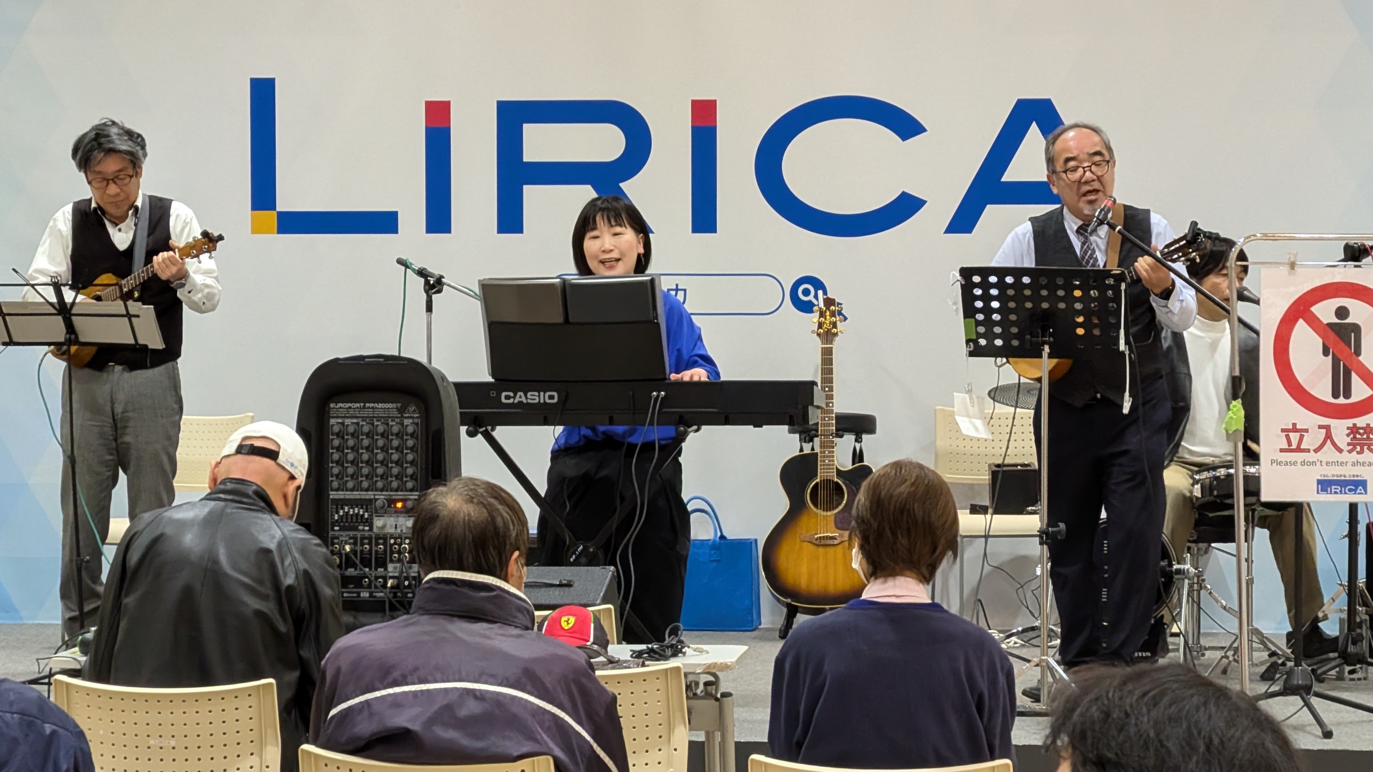 福田さんは軽快にウクレレを奏で、ボーカルとキーボードを担当した金さんはパワフルな美声を響かせました。サポートメンバーも加わって、松任谷由実の「卒業写真」やDREAMS COME TRUEの「未来予想図Ⅱ」などを歌い上げ、買い物客らはテーブルに腰掛けながら、ゆったりと聞き入っていました。